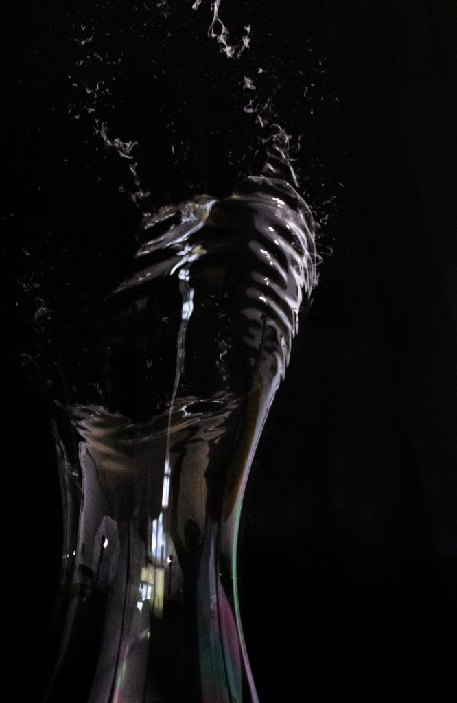 This image shows a bubble popping mid-air. The bubble had a combination of red and blue food coloring in it but was also edited to enhance the color and darken the background.