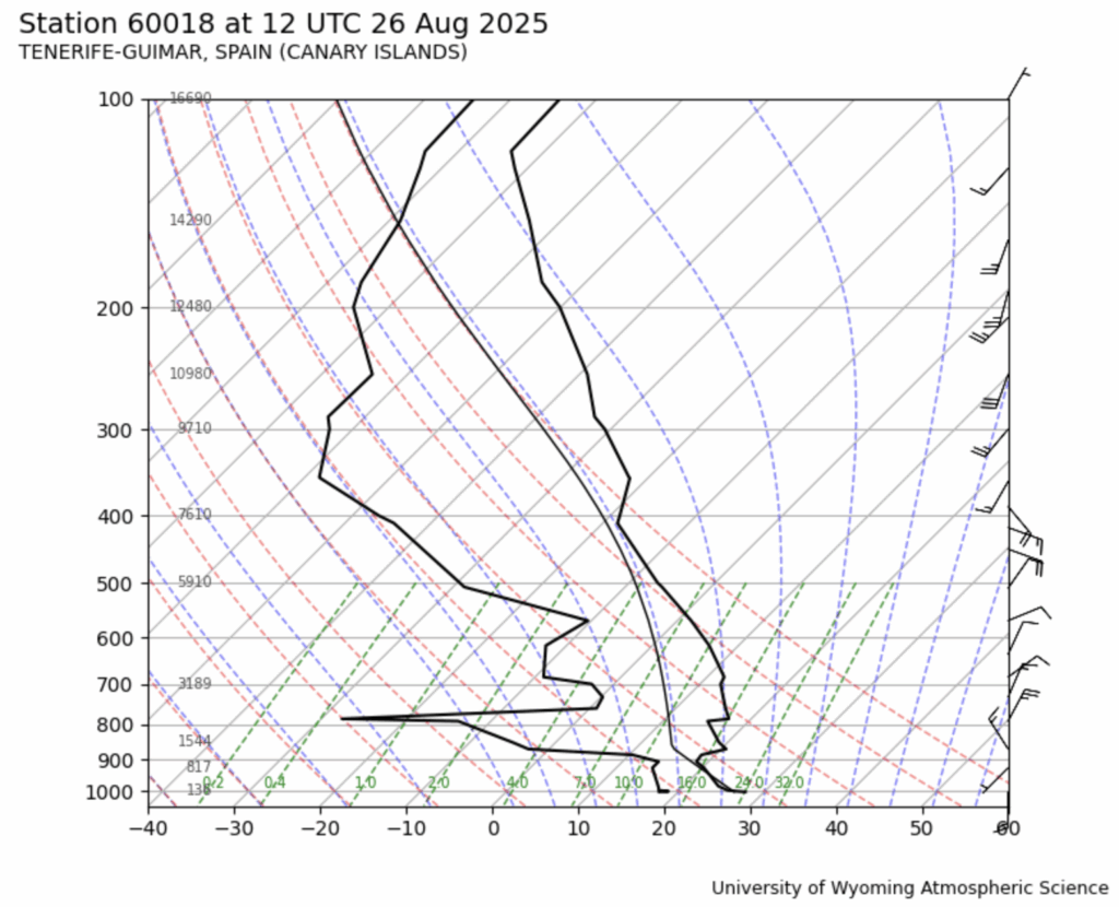 The corresponding Skew-T diagram from Tenerife-Guimar at 12 UTC 26 Aug 2025 shows a strong inversion near 850 hPa, a moist boundary layer, and a second partially humid layer around 600 hPa, these conditions perfectly explain the layered, stable cloud structure seen in the image. The dry upper air allowed vivid sunset colors to form as light scattered through the subtropical haze typical of late summer evenings in Canary Islands.