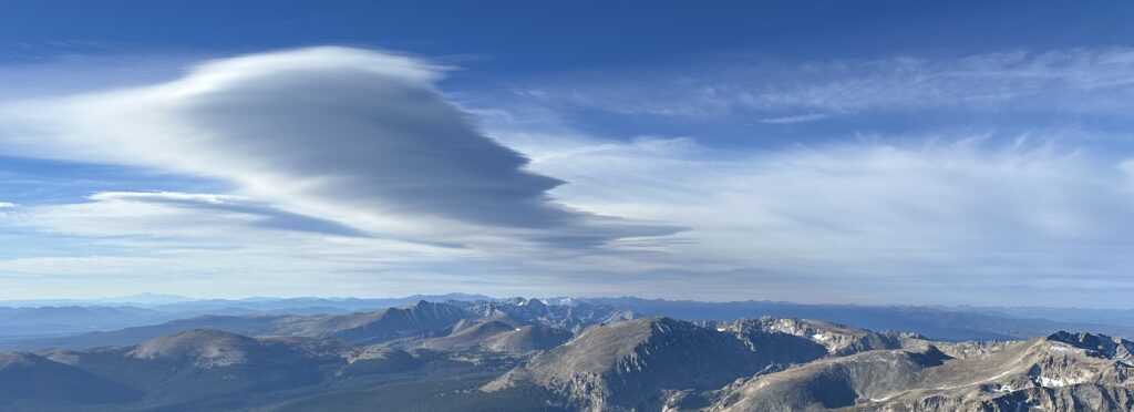 This image was captured on a hike up Longs peak which, at the time, was just to capture the scenery, shown in figure 3, but upon later review was an excellent cloud photo. A lenticular cloud produced by smooth airflow over the mountains is a great example to analyze the atmosphere stability that allowed its formation. The photograph was taken from the summit of Longs peak with views down the Front and Gore ranges.