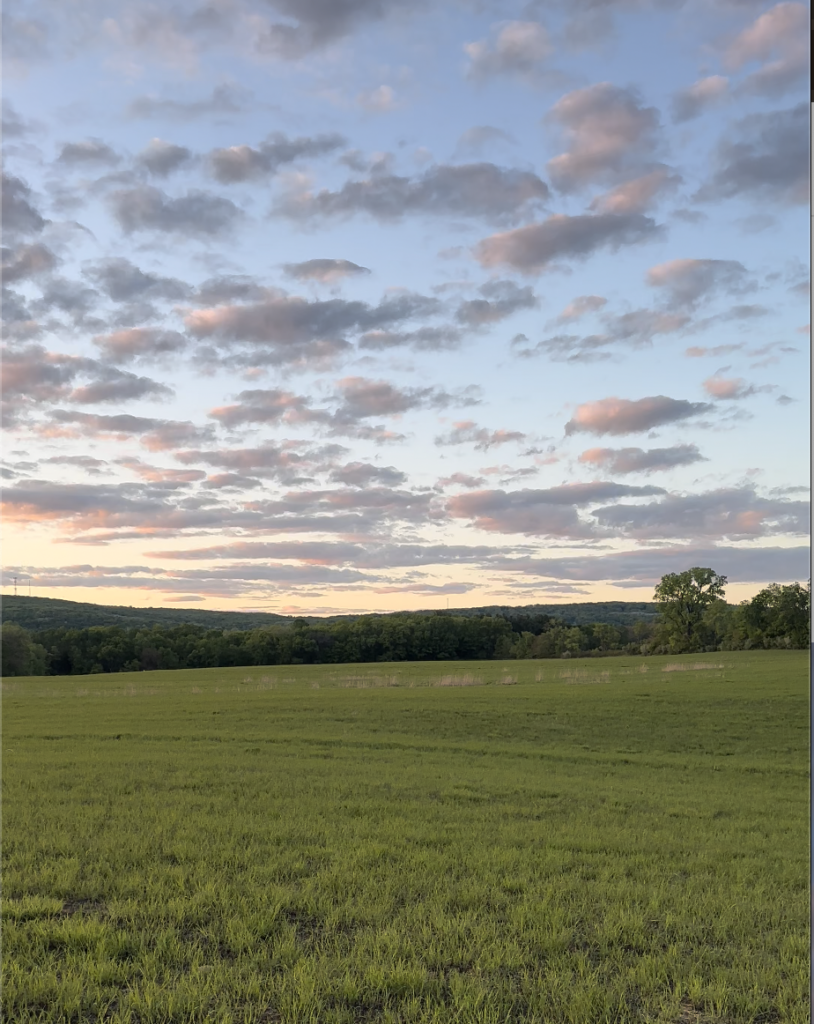 I like the contrast of the green field with the blue and pink sky, and I like that you can see far towards the horizon and giving perspective with the clouds getting smaller but changing in character and being a little longer.