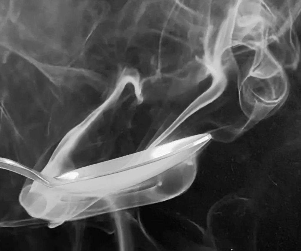 Smoke flows over the curved surface of a spoon, demonstrating laminar flow where the air moves evenly around the surface before transitioning into turbulent flow.