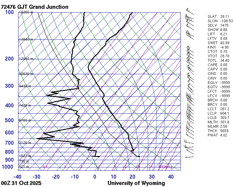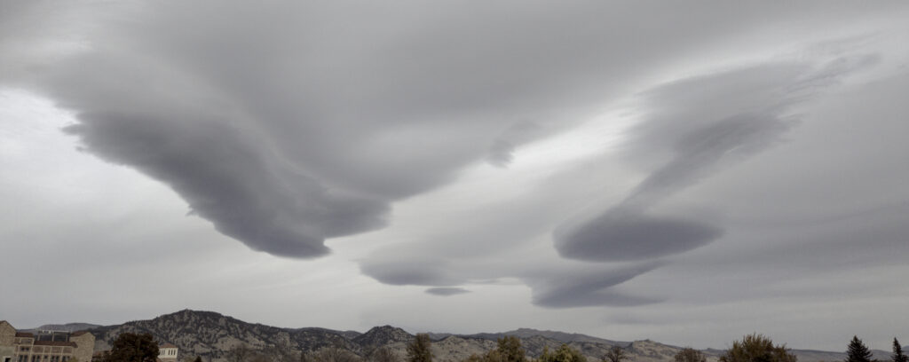 This image was taken on top of the parking garage near Engineering Drive on the CU Boulder main campus at 7:56 am on October 31. The relevant Skew-T diagram shows that clouds were likely present around 2500 meters. In my image, some altocumulus lenticularis, altocumulus opacus, and stratus clouds might be present, though I am not confident in my identification. Because the CAPE value is 0.00, the atmosphere can be considered stable.