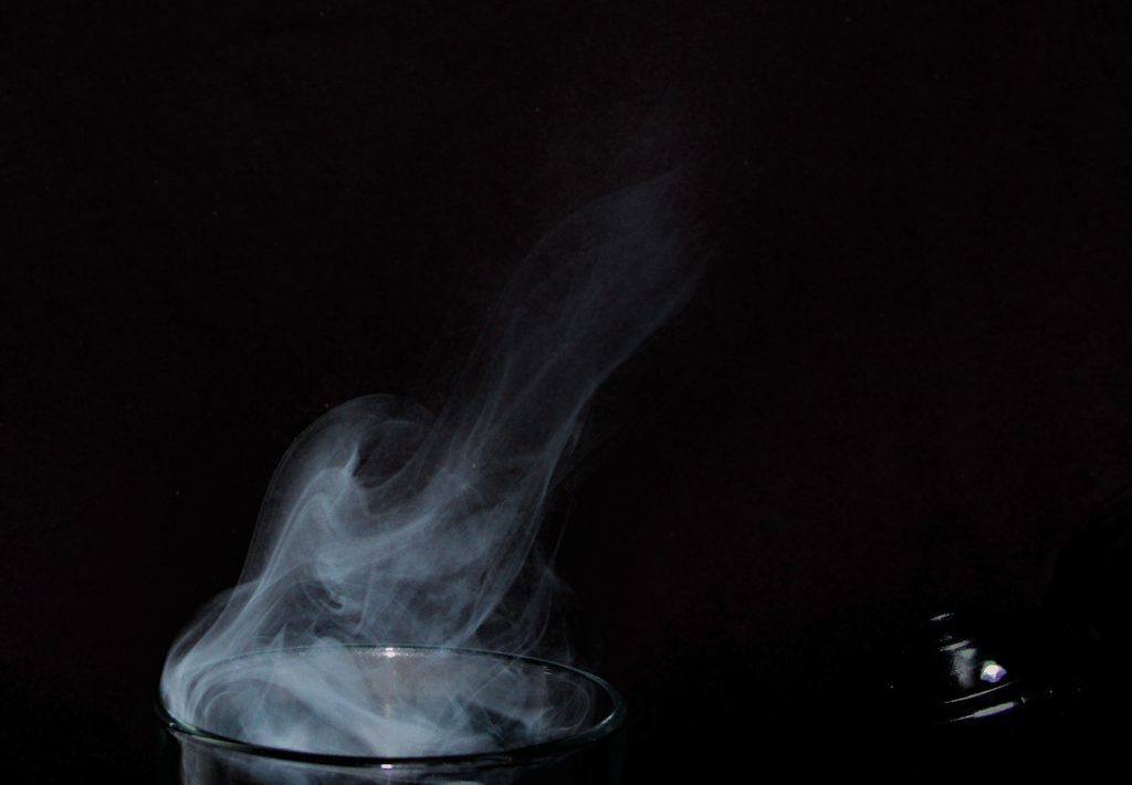 Incense smoke that is denser than air rises out of the glass due to the Bernoulli Effect from a compressed air flow outside the glass.