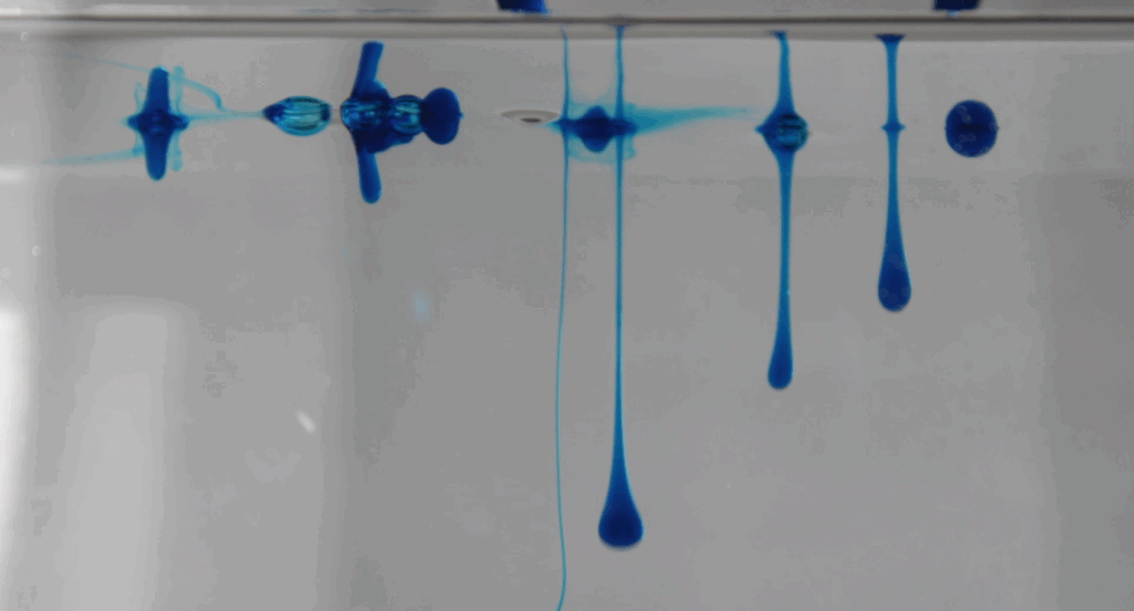 Rayleigh–Taylor-like Instability of Detergent in Water. Viscous yet dense laundry detergent sits on the top of water due to surface tension. However, the higher density leads to the falling and “fingering” of the detergent droplet, which is extended into long strands, likely because of the high viscosity and water surface tension.