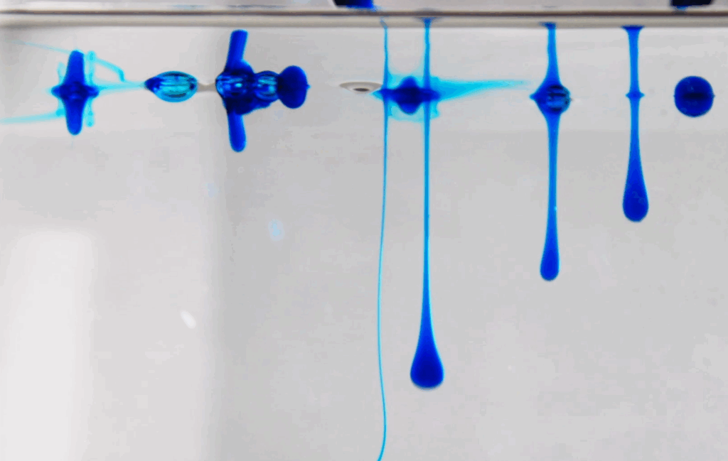 Rayleigh–Taylor-like Instability of Detergent in Water. Viscous yet dense laundry detergent sits on the top of water due to surface tension. However, the higher density leads to the falling and “fingering” of the detergent droplet, which is extended into long strands, likely because of the high viscosity and water surface tension.