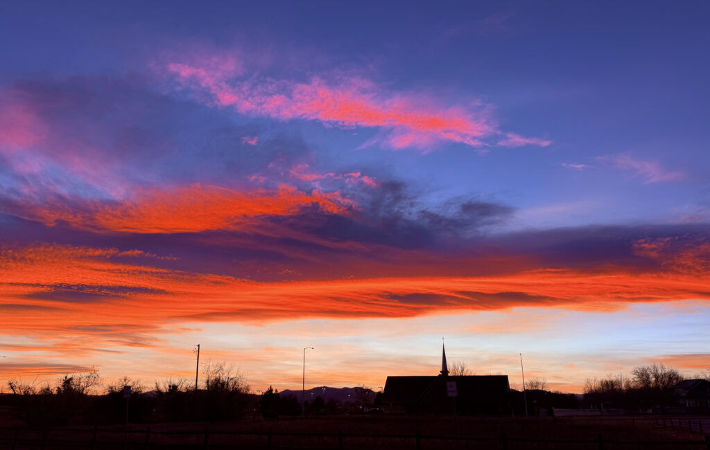 This photo was taken in Broomfield Colorado using an iPhone 16 Pro Max in portrait mode. The camera was stabilized and aimed toward the western horizon during the evening light so the colors stayed clean and the gradients in the sky remained smooth. The phone captured the intense oranges and magentas in the mid level cloud deck while preserving the deep blues in the upper atmosphere. The goal was to record the full structure of the sunset scene including the layered sheets of color, the darker interior shadows, and the softer high clouds that picked up the last light of day.