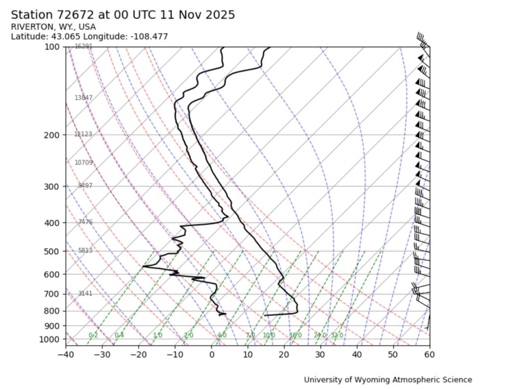 To analyze the atmosphere I used the University of Wyoming’s Riverton sounding from 00Z on November 11 2025 which represents the evening of November 10 in local time. The sounding shows a dry lower troposphere and a distinct moist layer centered between 500 and 400 millibars which supports the formation of altostratus and altocumulus. A second moist layer near 250 millibars corresponds to the thin cirrus that carried the upper pink tones in the image. The profile was stable with no buoyant energy and no CAPE which favors smooth stratified clouds rather than deep convection. These layers matched the visual appearance in the photo where the mid level clouds carried the strong orange and red light while the higher cirrus took on softer pink illumination as the sun moved below the horizon.