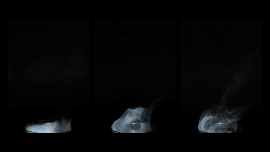 This is a progression picture of incense that had been collected in a cup as it flows out due to the Bernoulli effect. A jet fan was positioned to the right and pointed up, which made for cool visuals as it left the cup.