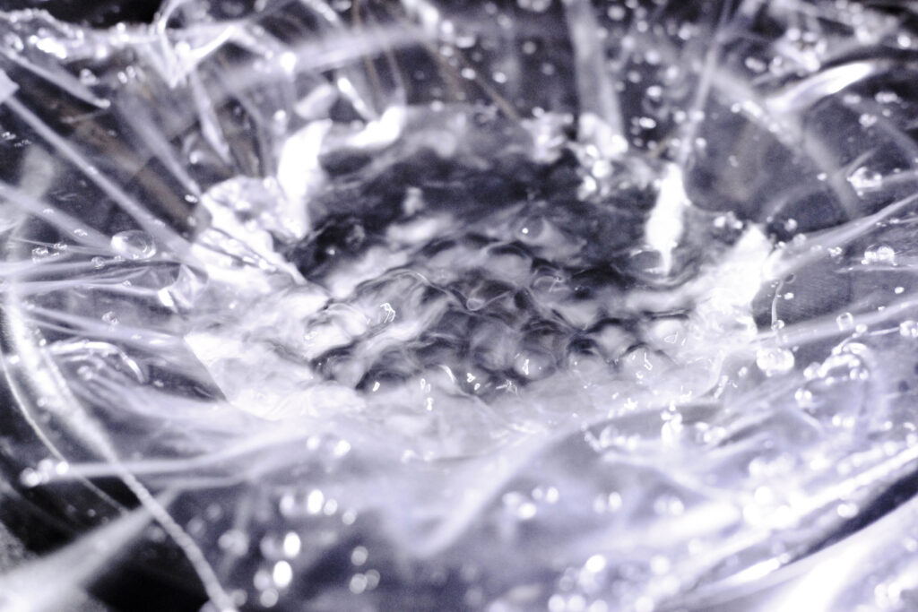 A subwoofer driven at mid-bass frequencies excites a thin water layer on plastic wrap, producing Faraday waves and complex ripple structures. Grazing flashlight illumination reveals the sharp wave crests, droplets, and patterned surface instabilities formed by the competition between inertial forcing and surface tension.