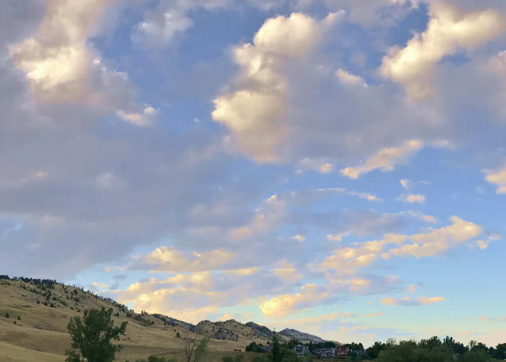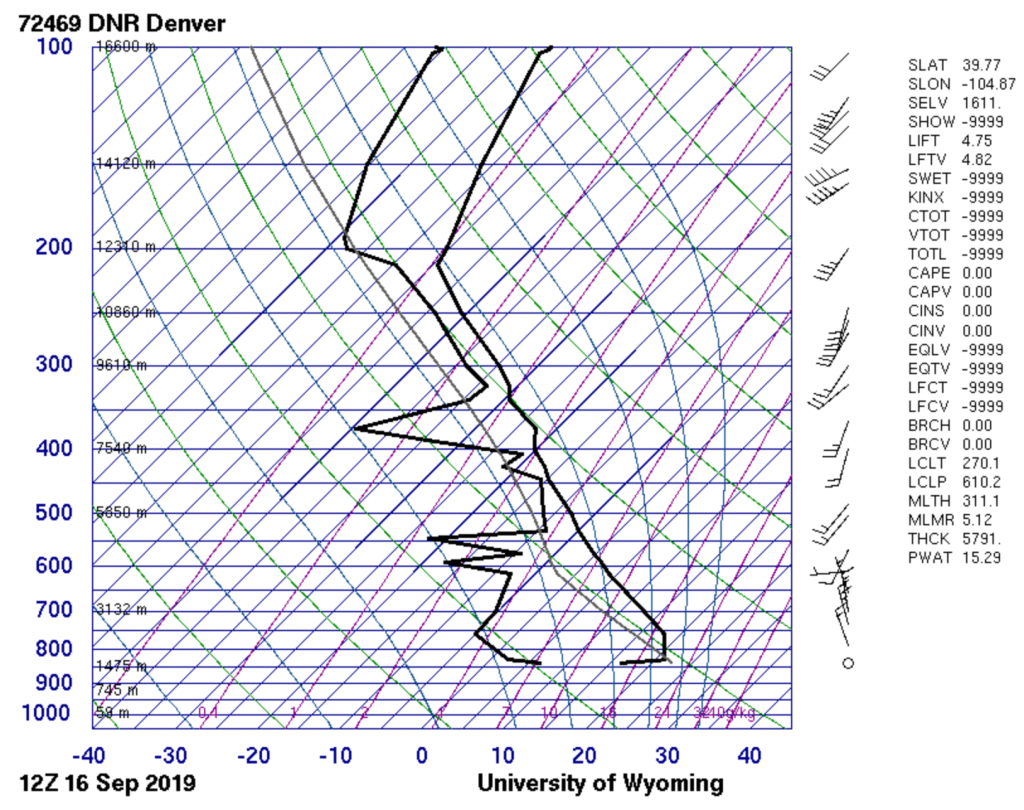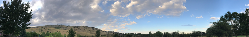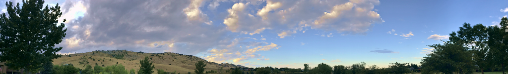 This panorama of stratocumulus clouds was taken in North Boulder facing northwest on September 16, 2019 at 6:27pm MDT. Image shot with an iPhone 7, with an f-stop of 1.8, ISO 80, shutter speed of 1/1008 second, and focal length of 4.00 mm. The corresponding skew-T diagram shows the atmosphere was stable. Immediately below is the raw version of this image; few adjustments were made to produce the final version (slightly increasing saturation and contrast).