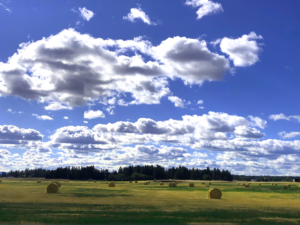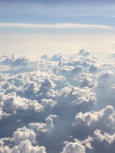 So now we know how to determine whether the atmosphere is stable or unstable. What does that tell us about the clouds? In an unstable atmosphere, localized variations in temperature will trigger rising air — thermals — over here and over there but not in between, so we will get clumps of cumulus clouds. There are many types of cumulus clouds, and they can form at any altitude, as discussed previously. One aspect they share is flat bottoms, at least when they are formed in unstable air (cumulus can also sometimes form in stable air, as we’ll see later). As air is lifted and cooled, it will reach a height at which condensation begins: the lifting condensation level (LCL) , another index shown on the Skew-T diagram. This height is fairly uniform over a large area, resulting in a common cloud base height, as shown in Figure 1.