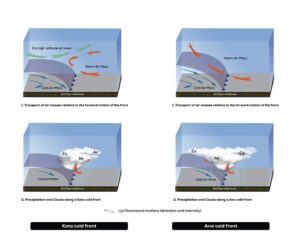 Cold fronts can be much more complex, depending on the exact shape of the front, the upper air winds, and the relative humidity of the various air masses . Figure 3 shows two types of cold front, the Ana front, and the Kata front. Here in Boulder, Colorado, we often get Ana fronts in winter, where we have upslope winds (from east to west) that bring us the distinctive odor of the stockyards in Greeley. In this case, precipitation develops during or after passage of the cold front and its accompanying low pressure region.